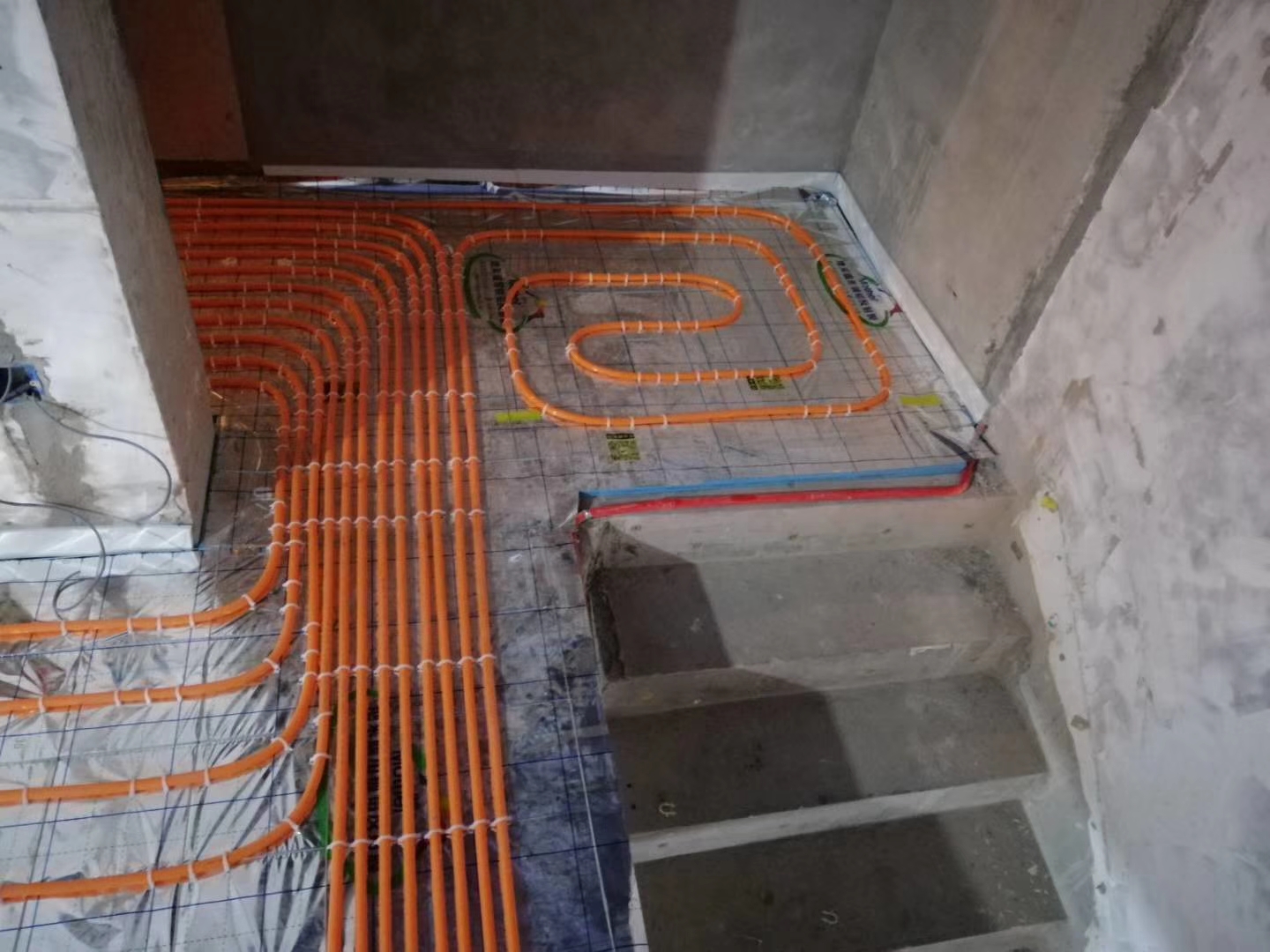 第一步是鋪設保溫板和反射膜。在我們把地面清理干凈以后,首先在原有地面上鋪我們選擇的擠塑板,擠塑板一定要鋪得平整嚴密,然后用膠帶進行固定。在擠塑板的上面開始鋪反射膜,反射膜要鋪嚴,反正膜交接的地方同樣也要使用膠帶進行固定。第二步是鋪底層鋼筋網(wǎng)片。鋼筋網(wǎng)片的規(guī)格一般是10mm×10mm,鋼筋網(wǎng)片所使用鋼筋的直徑一般是3mm。鋪設鋼筋網(wǎng)片的目的也就是為了固定我們的地盤管,防止位移以及澆筑混凝土時出現(xiàn)的管道的上浮等情況。第三步是鋪地采暖的地盤管道。地采暖的地盤管道就是地采暖的地盤管的安裝,具體安裝的時候是從分集水器開始,按照我們的設計要求鋪設每個房間的地采暖管道。這里要求的是管道之間的間距要符合要求,另外每個回路的長度要大概一致。此外單個的長度盡量要控制在100米以內。最后使用扎帶把地才能管道與鋼筋網(wǎng)片進行固定。第四步是鋪設上層鋼筋網(wǎng)片。在地采暖管道鋪設完成以后,我們需要在地采暖管道的上層再鋪設一層鋼筋網(wǎng)片。鋪設這層鋼筋網(wǎng)片的作用是防止我們的后澆層出現(xiàn)開裂。在鋪設完上層鋼筋網(wǎng)片以后,一定要把上下層鋼筋片使用扎帶進行固定牢固。第五步是澆筑回填層的混凝土。回填撐死凝土的厚度一般來說都是60mm左右,混凝土的強度一般都是C20的豆石混凝土。在澆筑的時候一定要注意防止地采暖管道出現(xiàn)位移和上浮的情況。澆筑完成以后要及時養(yǎng)護,以防止造成地面的開裂。