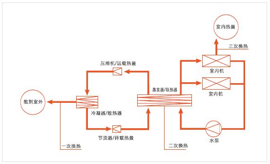 室外機一般稱為冷熱水機組,室內(nèi)機一般稱為風機盤管,通過水管連接。室外機組產(chǎn)生冷/熱水,用水泵送入每個室內(nèi)機,室內(nèi)空氣與水換熱達到溫度調(diào)節(jié)的目的。